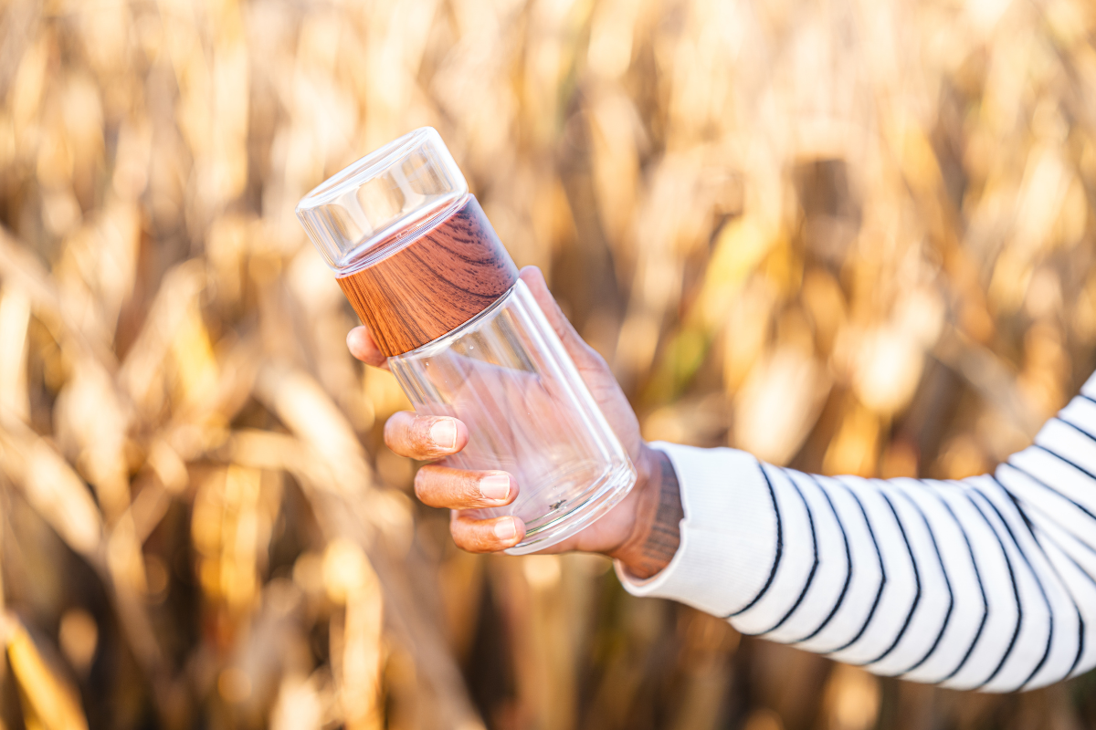 Bouteille en verre (double paroi) avec infuseur intégré permettant de transporter son Bulukutu partout et de le consommer tout au long de la journée !
